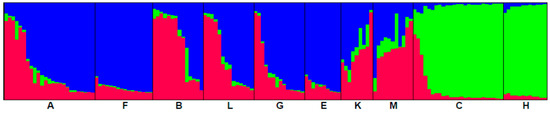 - Pritchard, J.K.; Stephens, M.; Donnelly, P. Inference of population structure using multilocus genotype data. Genetics 2000, 155, 945–959. [Google Scholar] [PubMed]