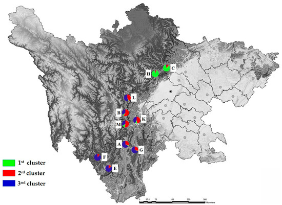 Thus, the C. yunnanensis populations showed a relatively high degree of genetic diversity. In addition, among the ten populations, populations C (Maoxian), B (Luding), and H (Wenchuan) exhibited a higher diversity, while populations E (Hanyuan) and F (Muli) showed a lower level of genetic diversity by comparison, which was also revealed from the Shannon’s information index (I values are as shown in Table 3).