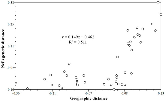 Micro-Checker 2.2.3 software was used to check the SSR loci for null alleles and possible misprints [23]. The parameters of genetic diversity (number of different alleles (Na), effective number of alleles (Ne), Shannon’s information index (I), observed heterozygosity (Ho), expected heterozygosity (He), inbreeding coefficient at the population level (Fis), inbreeding coefficient at the total sample level (Fit), genetic differentiation coefficient (Fst), and gene flow (Nm)) were calculated using the GenAlEx 6.51 Toolkit [24]. Nei’s genetic distance (1978) was calculated using Popgene 1.32 software [25], which was then used to construct the UPGMA tree with the NTSYS-pc 2.10s software [26,27], and to implement the PCoA analysis using GenAlEx 6.51. In addition, Nei’s genetic distance and geographic distance were analyzed for correlation with the Mantel test by NTSYS-pc 2.10s using 1000 random permutations [28].
