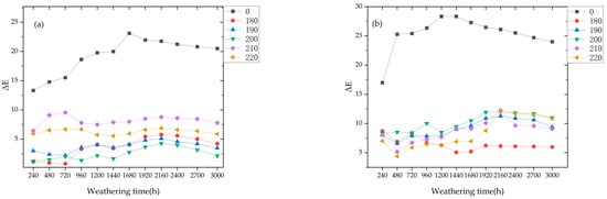As Figure 1a shows, the untreated larch ΔE increased before 1680 h and decreased from 1680 h to 3000 h. According to Figure 1b, the ΔE of the untreated poplars showed an upward trend before 1200 h, and then a downward trend, which was consistent with the results of Xing et al. [19]. The ΔE of the two untreated woods was greater than that of the heat-treated woods, suggesting that the heat-treated artificially weathered woods had better color stability.