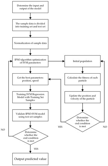 This paper presents an improved particle swarm optimization (IPSO) algorithm to optimize the support vector machine model. As a machine learning algorithm, SVM has unique advantages in dealing with nonlinear relation. Through nonlinear mapping, complex nonlinear problems can be transformed into linear regression problems in high dimensional space, and the complex relationship between multiple factors can be quickly learned and analyzed. The essence of the support vector machine (SVM) regression prediction model is to find the optimal relationship between each input and output sample on the basis of the limited sample data and give a reasonable output for the input samples in the test set. In order to optimize the predictive performance of the SVM model, IPSO is used to optimize and improve the SVM model. The process is as follows: First, determine the input and output of the model, divide the sample data into two categories—training and testing—and normalize all the sample data. Then the improved particle swarm optimization algorithm is used to optimize the population parameters and set the population size, nonlinear decreasing weight factor, iteration times, and other parameters. Next, the particle fitness value is calculated and the particle velocity, position, and other parameters are updated to determine the end conditions of the optimal parameters. Finally, the IPSO-SVM regression prediction performance is tested through the test set data. If the predicted value meets the set requirements, the predicted value is output. Otherwise, continue optimizing the parameters until the end condition is met. This process is shown in Figure 2: