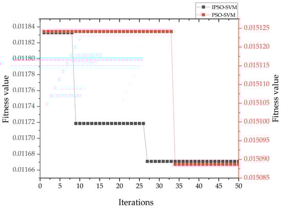 Fitness convergence curves of IPSO-SVM and PSO-SVM models.