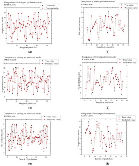 (a,b) are the prediction results of the IPSO-SVM model, (c,d) are the prediction results of the PSO-SVM model, (e,f) are the prediction results of the SVM model.