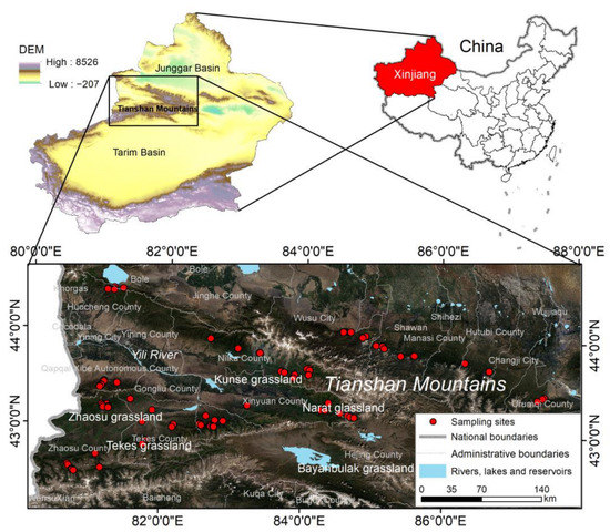The Tianshan Mountains, a prominent mountain range situated in central Xinjiang, China, function as a crucial impediment between the Tarim Basin and the Junggar Basin. The range stretches approximately 1700 km in an east-west direction and has a width of 250–350 km in the north-south direction. The climate has significant regional variations due to factors such as the geographical location of the mountains, the east-west trend of the ranges, and the multiple prevailing air currents. In the north-south direction, with the average annual temperature on the northern slopes ranging from 2.5 to 5 °C and 7.5 to 10 °C on the southern slopes [43]; the annual precipitation on the northern slopes amounts to 500–700 mm, while the annual precipitation on the southern slopes is lower than that on the northern slopes, with a difference of more than 150 mm [44]. In the west and east, annual precipitation drops from 600–800 mm to 176 mm, and the average annual temperature is highest in the western region (5–7 °C), followed by the eastern region (4.7 °C) and lowest in the central region (2–3 °C) [45]. In addition, the forest line experiences a gradual rise from west to east, with a corresponding narrowing of the bandwidth [46]. The study area is located within the central-western part of Xinjiang, bounded by geographic coordinates of 42°05′ N~44°38′ N and 79°53′ E ~88°01′ E. Spruce is the dominant species in the study area, growing on the northern slopes of the Tianshan Mountains at elevations of 1400–2800 m, along with Sorbus tianschanica Rupr., Betula tianschanica Rupr., Populus talassica Kom., Aegopodium alpestre Ledeb., etc. The understory soil is mostly mountain grey-cinnamon soil, contributing to the unique ecosystem of the region.