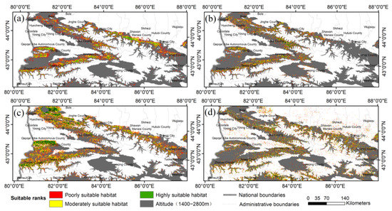 According to the MSS, 0.168, 0.164, 0.395, and 0.439 were used as thresholds of distribution models of first–fourth AGB classes, respectively, and the probability above this threshold was classified into three suitability ranks using the natural breaks (Jenks) method (Figure 2). Suitable areas for first–fourth AGB classes are 11.10 × 106 km2, 83.76 × 105 km2, 19.69 × 106 km2 and 16.81 × 106 km2, respectively. In terms of spatial distribution characteristics, the distribution of the second AGB biomass class is almost extremely low potential in Hutubi County, Changji City, Urumqi County and Zhaosu County compared to the first AGB class. In contrast to the first and second AGB classes, the suitability habitat of the third AGB class expands considerably outwards, with the most notable expansion in the western region (e.g., Bole, Qapqal Xibe Autonomous County, Zhaosu County, China, etc.). Unlike the expansion of the third AGB class, the expansion of the fourth AGB class was distributed beyond the actual distribution of spruce forests (elevation from 1400 to 2800 m) and there was no obvious distribution pattern. The environmental variables involved in the modeling of the different AGB classes are important factors influencing spatial distribution.