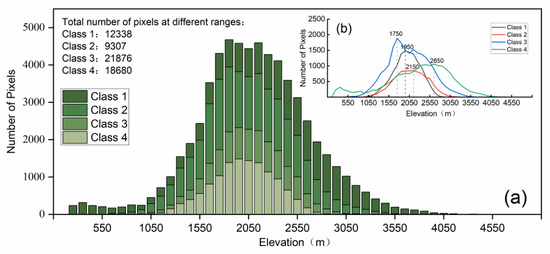 The number of potential distribution pixels of spruce forest with different AGB classes at different elevations. Figure (a) shows the cumulative number of pixels for the four biomass classes at different elevation gradients; Figure (b) shows four curves indicating the number of pixels for each of the four biomass classes as a function of elevation gradient.