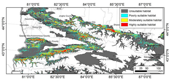 The MaxEnt modeling approach is a widely-used method for predicting the spatial distribution of species and assessing their habitat suitability [51,52,53]. This approach requires three main input data: (1) the location of known species occurrence points, (2) the spatial extent of the study area, and (3) explanatory variables or covariates that describe the environmental conditions at the occurrence points. The MaxEnt model then estimates the probability of species occurrence across the study area by calculating the distribution of “point” probabilities across the image space. The optimal probability distribution is then selected based on the entropy of the predicted probability distribution. The MaxEnt software version 3.4.4 utilized in this study was obtained from the online resource ((https://biodiversityinformatics.amnh.org/open_source/maxent/) (accessed on 8 July 2022)). This software is widely recognized for its robustness and efficiency in species distribution modeling and has been used in numerous ecological studies.