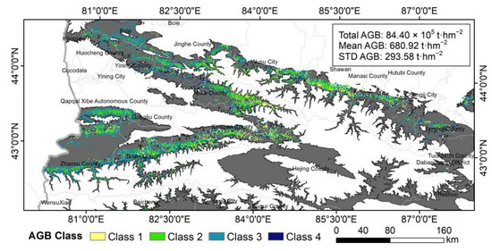 Spatial distribution of above-ground biomass (AGB). For first AGB class, AGB values are lower than 312 t·hm−2; for second AGB class, AGB values range from 312 t·hm−2 to 602 t·hm−2; for third AGB class, AGB values range from 602 t·hm−2 to 1071 t·hm−2; for fourth AGB class, AGB values are higher than 1071 t·hm−2.