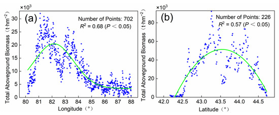 Variation of AGB with latitude and longitude in the Tianshan Mountains. Figure (a) shows a linear fit to total biomass per 0.01° longitude; Figure (b) shows a nonlinear fit to total biomass per 0.01° longitude.