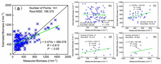 Fitted curves of measured AGB and estimated AGB. Figure (a) represents the fitted curve for all AGB data; Figure (b) represents the fitted curve at the first biomass class; Figure (c) represents the fitted curve at the second AGB class; Figure (d) represents the fitted curve at the third AGB class; Figure (e) shows the fitted curve at the fourth AGB class.