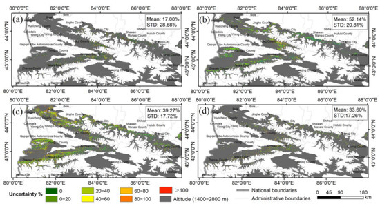 Uncertainty in the spatial distribution of AGB. Figure (a) shows uncertainty at the first biomass class; Figure (b) shows uncertainty at the second AGB class; Figure (c) shows uncertainty at the third AGB class; and Figure (d) shows uncertainty at the fourth AGB class.