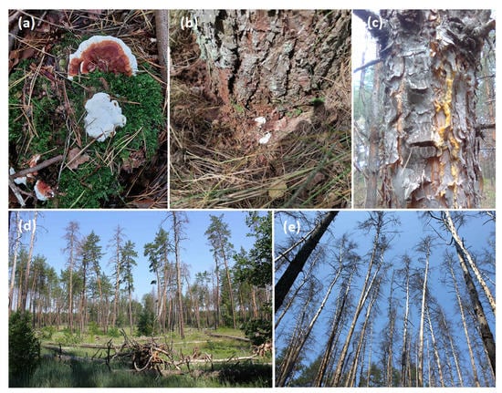 - Mykhaylichenko, O. Zmina biometrychnykh pokaznykiv khvoyi sosny zvychaynoyi v oseredkakh korenevoyi hubky. [Biometrical indices variation for scots pine needles in annosum root rot foci]. For. For. Melior. 2015, 127, 187–192. (In Ukrainian) [Google Scholar]
