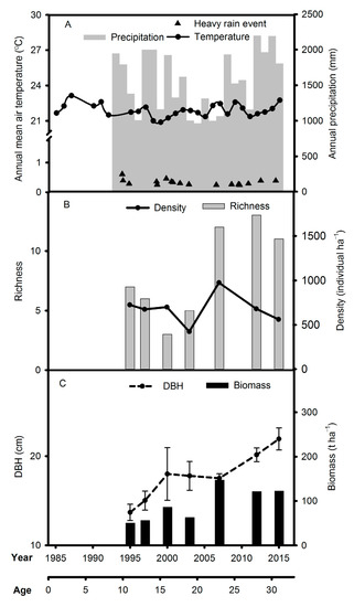 Meteorological records and forest inventory after the initiation of the A. mangium plantation: (A) The annual mean air temperature, annual precipitation, and heavy rainfall events (daily precipitation > 100 mm) from 1984 to 2015 recorded at the Heshan station in southeastern China; (B,C) the dynamics of tree density, species richness, DBH (diameter at breast height), and tree biomass in the permanent plot of A. mangium monoculture after 31 years of planting (1984 to 2015). Error bars represent the standard deviation of tree species’ DBH in the A. mangium monoculture.