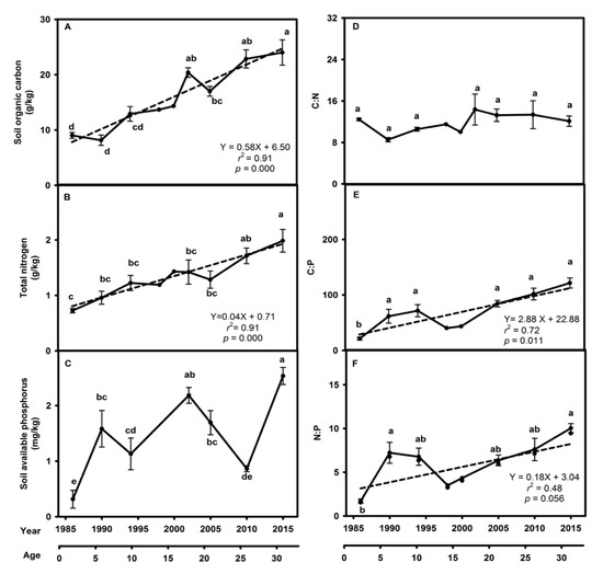 (A–C) Dynamics of soil organic carbon, total nitrogen, and available phosphorus concentrations; (D–F) the ratio of soil organic carbon to total nitrogen (C:N), soil organic carbon to total phosphorus (C:P), and soil total nitrogen to total phosphorus (N:P), in the A. mangium monoculture during 31 years of planting. The black dashed lines in the panel indicate the linear regression with plantation age. Error bars represent the standard error (n = 4). Data on soil organic carbon and total nitrogen concentrations in 1998 and 2000 was referred to previous study results [36,46]. Differernt lowercase letters in the figure indicate significant differences between the planting year.