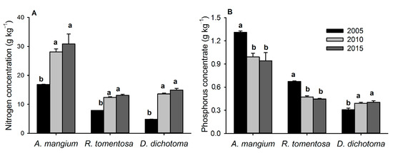 Total nitrogen (A) and phosphorus (B) concentrations of A. mangium, R. tomentosa, and D. dichotoma leaves in 2005, 2010, and 2015. The different lowercase letters represent significant differences among the three time points of sampling at p < 0.05. Error bars represent the standard error (n = 4).