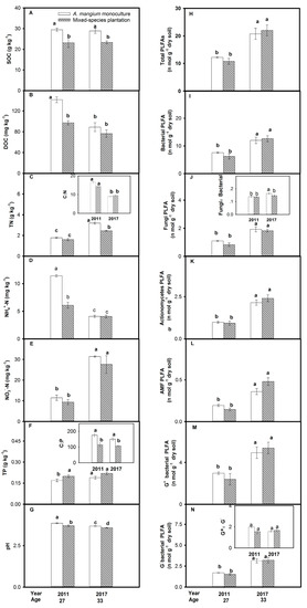 Soil physiochemical properties and soil microbial phospholipid fatty acids (PLFAs) in the A. mangium monoculture and the A. mangium mixed-species plantation in 2011 and in 2017. SOC, DOC, TN, and TP represent soil organic carbon, dissolved organic carbon, total nitrogen, and total phosphorus, respectively. AMF, G+, and G− represent arbuscular mycorrhizal fungi, Gram-positive bacteria, and Gram-negative bacteria, respectively. The C:N and C:P represent the ratio of soil organic carbon to total nitrogen and soil organic carbon to total phosphorus, respectively. (A–G) represent soil organic carbon, dissolved organic carbon, total nitrogen, NH4+, NO3−, total phosphorus and pH in the A. mangium monoculture and the A. mangium mixed-species plantation in 2011 and in 2017, respectively. (H–N) represent total PLFAs, bacterial PLFA, fungi PLFA, actionmycetes PLFA, arbuscular mycorrhizal fungi PLFA, gram-positive bacteria PLFA and gram-negative bacteria PLFA in the A. mangium monoculture and the A. mangium mixed-species plantation in 2011 and in 2017, respectively. The micro-panel in (C,F,J,N) represent the ratio of soil organic carbon to total nitrogen, soil organic carbon to total phosphorus, fungi PLFA to bacterial PLFA, and gram-positive bacteria PLFA to gram-negative bacteria PLFA in the A. mangium monoculture and the A. mangium mixed-species plantation in 2011 and in 2017, respectively. Different lowercase letters represent significant differences between the two plantation types at p < 0.05 (n = 3).