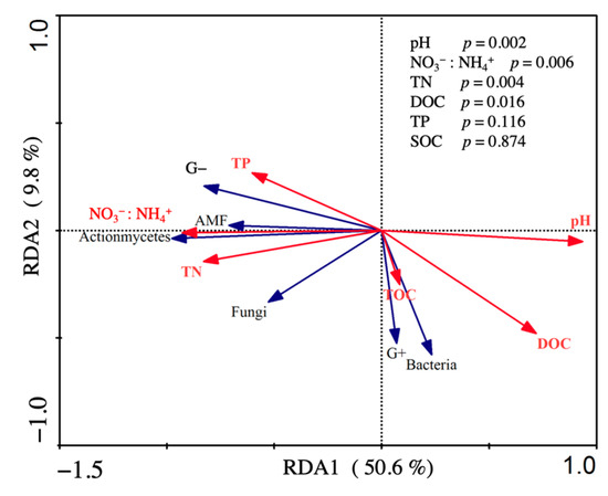 The relative abundance of soil microbial PLFAs was insignificantly different between the monoculture plots and the mixed-species plantation plots (Figure 5H–N and Table S5), but was significantly increased by planting year (from 2011 to 2017) in both the monoculture plots and mixed-species plantation plots. In addition, the RDA results showed that soil physiochemical properties (i.e., pH, NO3−-N:NH4+-N ratio, and the concentrations of TN, DOC, TP, and SOC) could explain 60.4% of the total variation in the relative abundance of soil microbial PLFAs, including 50.6% at axis 1 and 9.8% at axis 2 (Figure 6). Among them, the soil pH, soil NO3−-N:NH4+-N ratio, and soil TN and DOC concentrations significantly contributed to the total variance (p < 0.016), while the concentrations of soil TP and SOC showed insignificant contributions (p > 0.116). Furthermore, there were negative correlations among the soil pH and the Gram-negative bacteria, AMF, and actinomycetes and among the soil DOC concentration and the Gram-negative bacteria, AMF, and actinomycetes. However, there were positive correlations among the soil TN concentration and AMF, fungi, and Gram-negative bacteria and among the ratio of soil NO3−-N:NH4+-N and AMF, fungi, and Gram-negative bacteria.