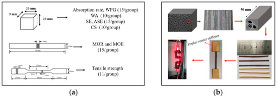 Furfuryl alcohol, sodium borate, citric acid, and oxalic acid were purchased from Sinopharm Chemical Reagent Co., Ltd. (Shanghai, China). Analytical-grade chemicals and deionized water were used. Moso bamboo (Phyllostachys edulis (Carrière) J. Houz) strips were purchased from a bamboo flooring enterprise located in Zhejiang Province, China. Bamboo samples were processed to the dimensions provided in Figure 1a, subsequently oven-dried at 103 °C and weighed, and finally conditioned in a humidity control box (23 °C/65% RH) at least 30 days before furfurylation.