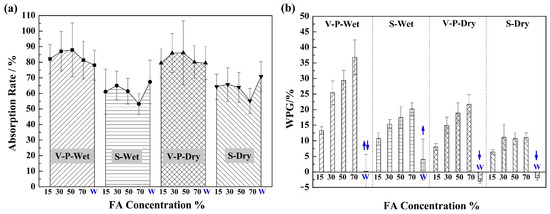 Absorption rate (a) and WPG (b) of bamboo furfurylated by different processes. V-P-Wet: samples furfurylated through vacuum pressure impregnation followed by wet-curing; S-Wet: samples furfurylated through soaking impregnation followed by wet-curing; V-P-Dry: samples furfurylated through vacuum pressure impregnation followed by dry-curing; S-Dry: samples furfurylated through soaking impregnation followed by dry-curing.