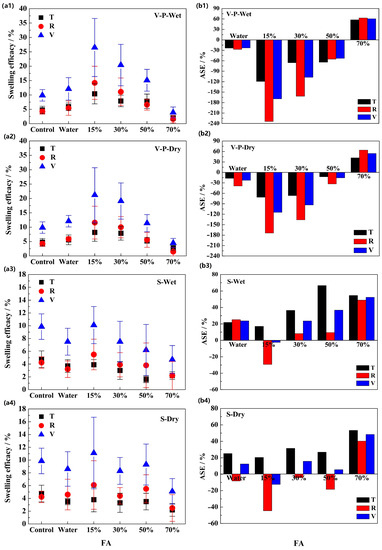 The tangential, radial, and volume sizes of both dry- and wet-treated bamboo were measured. SE and ASE were calculated according to Equations (3) and (8), respectively.