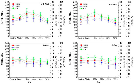 The MOR, MOE, and CS of the control and bamboo furfurylated by different processes. V-P-Wet: samples furfurylated through vacuum pressure impregnation followed by wet-curing; S-Wet: samples furfurylated through soaking impregnation followed by wet-curing; V-P-Dry: samples furfurylated through vacuum pressure impregnation followed by dry-curing; S-Dry: samples furfurylated through soaking impregnation followed by dry-curing.