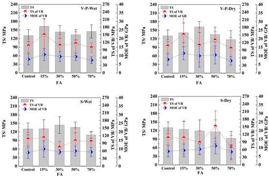 The effect of furfurylation on the bamboo mechanical properties at the organizational level was evaluated by examining its vascular bundle TS. Figure 5 shows the effects of the FA concentration, impregnation, and curing methods on the TS of furfurylated bamboo, as well as on the TS and MOE of a bamboo vascular bundle. It can be clearly seen that furfurylation had little effect on the TS of bamboo, except for the S-Dry process, which resulted in a decrease in the TS of the modified bamboo compared with the untreated bamboo. The TS of furfurylated bamboo under the V-P-Wet, V-P-Dry, and S-Wet conditions increased slightly.