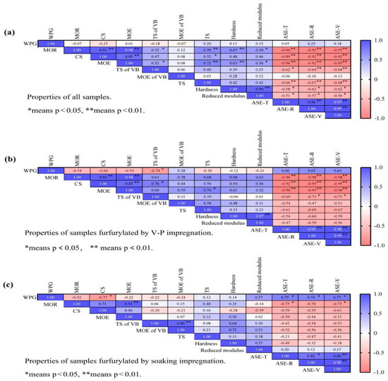 In order to further clarify the relationships between the physical and mechanical properties of furfurylated bamboo, a correlation analysis of these parameters across the samples, either being furfurylated through V-P impregnation or soaking impregnation, was carried out. Figure 7a shows the correlation analysis of the physical and mechanical properties of all the samples; no significant correlation between the WPG of furfurylated bamboo and its physical and mechanical properties can be observed. However, either a significant or an extremely significant positive correlation between the macro- and micro-mechanical properties was found, except for the MOE of the VB of furfurylated bamboo, but either a significant or an extremely significant negative correlation can be observed between the mechanical properties and ASE. Extremely significant positive correlations between the ASE-T, ASE-R, and ASE-T were also recorded. Figure 7b shows the correlation analysis of the physical and mechanical properties of the samples furfurylated through V-P impregnation. The WPG was negatively correlated with the TS of the VB and negatively correlated with other mechanical properties but not significantly. The MOE and CS were positively correlated with each other, while other mechanical strength parameters were positively correlated but not significantly. In addition, the MOE and CS were negatively correlated with ASE. Regarding the correlation analysis of the physical and mechanical properties of the samples furfurylated by soaking impregnation (Figure 7c), a positive relationship was found between the WPG and ASE, and a negative relationship was observed between the WPG and CS. Interestingly, the correlation between the mechanical properties and ASE was not significant.