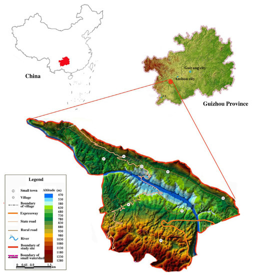 The study area was located on both sides of the Beipan River of Guanling County, Anshun City of Guizhou Province, China (105°36′30″~105°46′30″ E, 25°39′13″~25°41′00″ N) (Figure 1). The landform is a typical karst plateau canyon with a large proportion of bare and rugged surface. The terrain is strongly undulating with an elevation range of 600~1200 m. The annual temperature is 18.4 °C and total annual temperature is 6542.9 °C with an annual maximum and minimum temperature of 32.4 °C and 6.6 °C, respectively. The average annual rainfall is 1100 mm with uneven spatial and temporal distribution. The rainfall is mainly distributed from May to October, accounting for 83% of the annual total rainfall. The climate belongs to the humid subtropical monsoon climate with a warm and dry spring and a hot and humid summer. The rock is mainly limestone, and the soil is mainly calcareous soil and partly yellow soil. In the area, the karst rocky desertification happened extensively. The native vegetation of the subtropical evergreen-deciduous conifer-broadleaf mixed forest, is basically destroyed. The present vegetation is mainly secondary forest with Zanthoxylum planispinum var. dintanensis, Lonicera japonica, Toona sinensis, Broussonetia papyrifera, Celtis sinensis, Phyllanthus emblica, Opuntia stricta var. dillenii, Amomum villosum and so on.