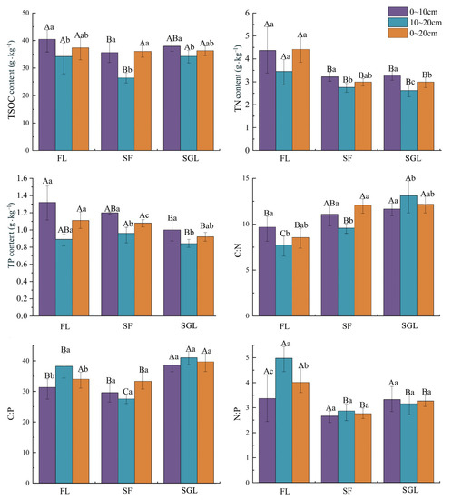 Soil C, N, and P contents and ratios of the three land use types studied. Note: FL, forest land; SF, slope farmland; SGL, shrub-grassland. Capital letters represent the significant difference between different land use types of the same soil profile and small letters represent the significant difference between different soil profiles of the same land use type (α = 0.05).