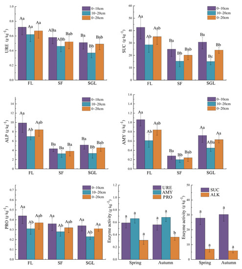 Five soil enzyme activities of URE, SUC, ALP, AMY and PRO in the three land use types studied and between spring and autumn. Note: FL, forest land; SF, slope farmland; SGL, shrub-grassland; URE, urease; SUC, sucrose; ALP, alkaline phosphatase; AMY, amylase; PRO, protease. Capital letters represent the significant difference between different land use types of the same soil profile and small letters represent the significant difference between different soil profiles of the same land use type (α = 0.05).