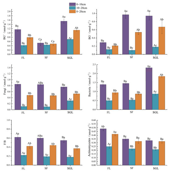 The PLFA concentrations of bacteria, BG−, BG+, actinomycetes, and fungi in the three land use types studied. Note: FL, forest land; SF, slope farmland; SGL, shrub-grassland; BG+, Gram-positive bacteria; BG−, Gram-negative bacteria. Capital letters represent the significant difference between different land use types of the same soil profile and small letters represent the significant difference between different soil profiles of the same land use type (α = 0.05).