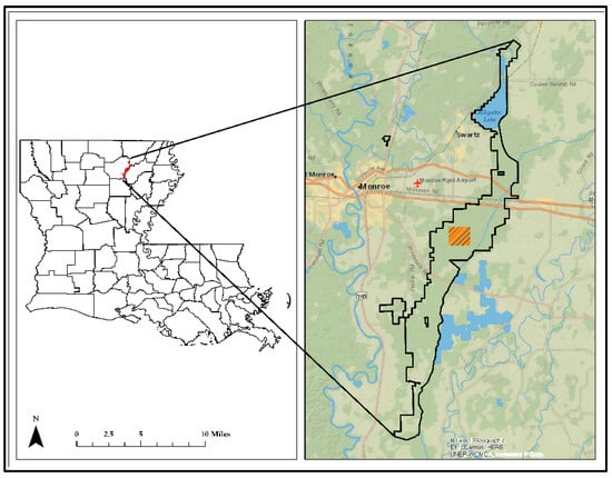 Map of Louisiana, showing the location of Russell Sage Wildlife Management Area (black border) in the northeast. The hatched area on the right indicates the location of the study site. (Basemap source: Esri Canada. “Topographic/Topographie” [Web Map]. Scale Not Given. “National Geographic World”. 4 May 2023. Developed in ArcGIS [ArcMap] Version 10.8.1.)