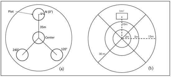Sixteen 1-ha sites were established within the RSWMA using Google Earth imagery and a random number generator. Each site contained four plots consisting of one center plot and three other plots located at 0°, 120°, and 240° from the center (Figure 2a). The distance from each of these plots from the central plot was 35 m and each plot was 15 m in radius. The plots were established using a protocol modified from the Terrestrial Carbon Observations: Protocols for Vegetation Sampling and Data Submission (TCO) []. Within each plot, all trees with a diameter at breast height (DBH) ≥10 cm were counted, taxonomically identified, and measured. Next, the species name, height class (0.5–<1 m and 1–2 m), basal diameter, percent cover, and the number of individuals for all woody shrubs and seedlings were recorded in a nested 2 m radius plot (Figure 2b). In addition, estimation of vegetation biomass and visual obstruction measurements (VOM) were taken in a 1 m2 plot, 10 m north of each plot center. The coordinates for each plot center were recorded using a GPS unit, and a PVC pipe was used to mark the center. Species identification of all plants sampled was accomplished using a combination of field guides, the United States Department of Agriculture (USDA) Plants database, and the university herbarium at the University of Louisiana Monroe.