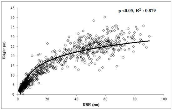 A regression model was developed to predict tree height from tree DBH. A total of 896 trees, representing 20 species, was used in regression analysis to generate a general height equation [H = 7.184 × ln(DBH) − 4.431, R2 = 0.879] (Figure 3). Individual species-based regression analysis was used to calculate species-specific height estimates based on DBH for use in certain allometric equations (Table 1). It should be noted that tree height equations based on one site are primarily for local use only since tree morphology may vary due to differences in ecosystem dynamics [].