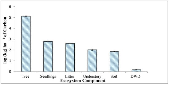 Total aboveground carbon stock for each vegetation component was calculated for the entire study area in terms of kg carbon per hectare (kg C ha−1) and later scaled to Mg (106 g) carbon per hectare (Mg C ha−1). Carbon stock per hectare was log transformed due to the disproportionate contribution by trees to the overall total carbon stock (Figure 4). The total carbon stock of all sampled “ecosystem components” [] (trees, woody shrubs and seedlings, understory vegetation, DWD, soil, and leaf litter) in the 4.48 ha study area was 598.503 Mg C (133.594 Mg C ha−1). Trees dominated the carbon stock, contributing to 132.4 Mg C ha−1 (99%) of the estimated total stock. While standing dead trees (snags) were sporadically encountered, all outside the plots, we acknowledge the contribution to the total aboveground carbon stocks, albeit marginally so in our study site. However, studies have reported snags to contribute to 3.30 Mg ha−1 for oak–hickory stands and 5.80 Mg ha−1 for elm–ash–cottonwood stands of around 80–90 years old [].
