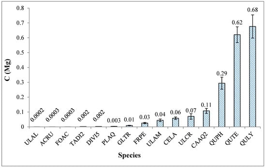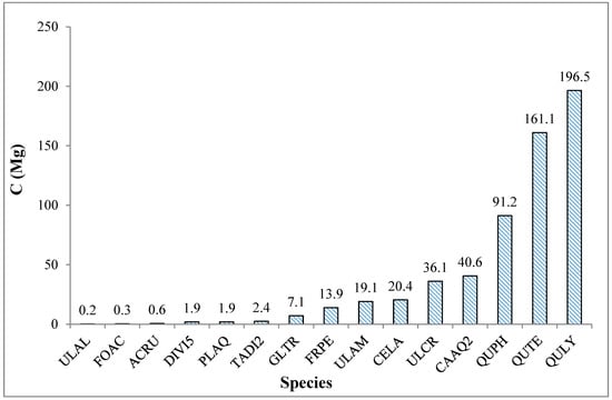 Some species were underrepresented in the sample; therefore, the average carbon stock per species was weighted by the number of each species sampled (Figure 6). The largest carbon stocks were contributed by Quercus lyrata, Quercus texana, and Quercus phellos (196.5, 161.1, and 91.2 Mg C, respectively), while Ulmus alata (0.2 Mg C) had the least. A similar trend was observed for carbon stocks per unit area with Quercus lyrata, Quercus texana, and Quercus phellos (43.9 Mg C ha−1, 36.0 Mg C ha−1, and 20.4 Mg C ha−1, respectively).