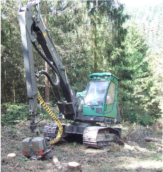 A single pass of the MHT9002HV tracked harvester induced little change in the soil during logging in a terrain with a steep slope of 14.9° (33.2%). At the site of the machine’s track passage, only at a depth of 16 to 20 cm of the operating trails a significant increase in penetration resistance was noted. This was due to: