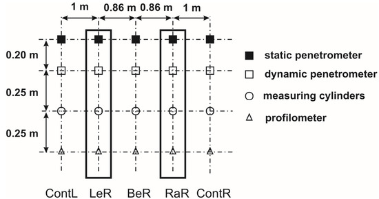 After the harvester carried out its work, on horizontal transects of three operational trails (Opt1, Opt2, Opt3), according to Figure 2, penetration resistance measurements were taken with the use of two penetrometers: static (four measurements) and dynamic (one measurement). Measurements were made in the left ruts (LeR), between ruts (BeR), in right ruts (ReR), and at a distance of 1.0 m from the right (ContP) and left (ContL) ruts, to a depth of 40 cm at distances, every 20 cm along the trace. Three measuring cylinders each were also taken (vol. Vc 250 cm3, height 7 cm, diameter 6.8 cm) from depths of 10 cm; from 11 to 20 cm, and from 21 to 30 cm. The mapping of three terrain profiles perpendicular to the axis of each operational trail was also carried out, with 2.8 m wide trails and 0.25 m apart using a laser profilometer (measuring across the trail’s width, every 2.5 cm) [40].