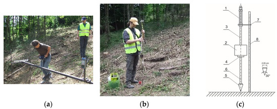 As a dynamic penetrometer to determine soil penetration resistance PRdyn [Pa], it was used as a device built on the basis of a solution presented in a publication by Harrick and Jones [32], Figure 3b,c. This penetrometer held by the handle (1) was equipped with a freely falling weight (2) m = 2 kg along the guide rod (3) length L = 0.3 m hitting the bumper (4). The mass of the penetrometer m′ without weight m was 2.5 kg. As the indenter was used cone (5) with an opening angle of α = 30° and a base diameter of D = 2.03 cm, introduced into the soil through the insertion rod (6) [31,32]. After each impact of the weight causing gradual immersion of the indenter into the soil, the indentation depth was measured thanks to the indicator (7) and measuring scale (8) with accuracy ± 1 mm.