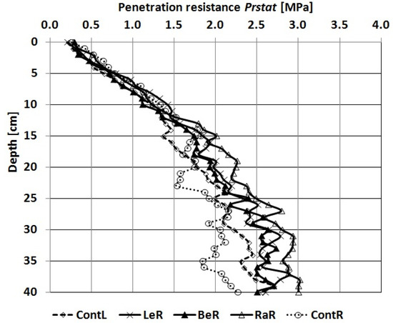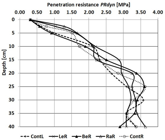 In the case of the measurement results obtained with the dynamic penetrometer (Table 5), statistical differences in PRdyn were noted for individual measurement locations depending on the depth and also for SoL4 (16–20 cm). The results of the PRdyn measurements made with the impact penetrometer (Table 5) were usually higher than those obtained with the static penetrometer PRstat (Table 4) and reached 1.28 MPa at depths of up to 10 cm, 2.19 MPa at depths of 11–20 cm, up to 3.38 MPa for 21–30 cm, and up to 3.62 MPa for 31–40 cm. The highest value of PRdyn was 3.75 MPa also on the level SoL6. The course of changes in PRstat and PRdyn (Figure 4 and Figure 5) was similar.