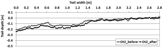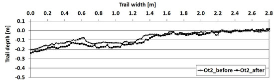 Profiles of the Ot2 operational trail before and after the passage of the harvester.