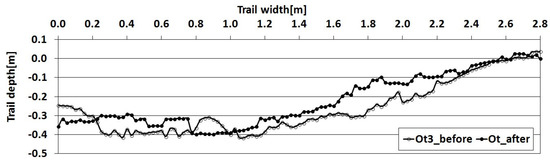 Profiles of the Ot3 operational trail before and after the passage of the harvester.
