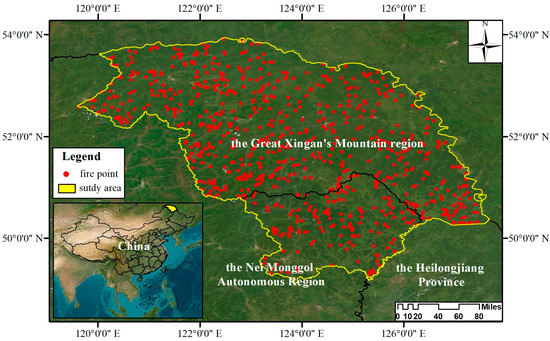 Wildfires are common in the Great Xing’an Mountain region. In this region, 846 wildfires were reported between 2000 and 2020, burning 1.02 million hectares of forest. Because the Great Xing’an Mountains prevent water vapor from entering the northern region, the burning area in the north (about 0.78 million ha) is much higher than the south (about 0.23 million ha). Lightning strikes are the primary source of wildfires, accounting for 96% of wildfire occurrences and 99% of burning area. Wildfires often occur in spring (May and June) and autumn (September and October), with the spring accounting for 66% of wildfire occurrences and 78% of burning area. The above information was obtained from the wildfire records of the Great Xing’an Mountain region from 2000 to 2020, which was provided by the Forest Fire Prevention Department of the Greater Xing’an Mountains Forestry Group Corporation. The wildfires in the study area all occurred in forest areas, so this study used wildfire to represent wildfires that occur in forests.