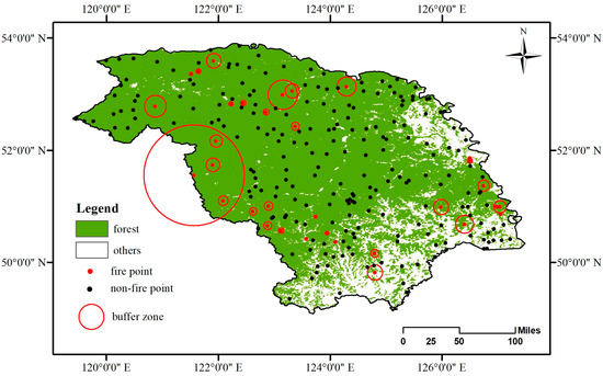 The distribution of fire points, the buffer zone of each fire point, and selected non-fire points from 31 May to 3 June 2018. Forest area were extracted from the MODIS land cover product MCD12Q1 in 2010 and classified into forest areas according to categories 1–8 of the IGBP classification scheme.