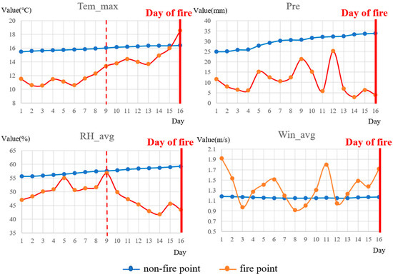 Weather factors include daily maximum temperature (Tem_max), daily mean relative humidity (RH_avg), daily precipitation (Pre), and daily mean wind speed (Win_avg). Figure 3 shows their changes within the 16 days before the fire and the non-fire points. We found that Tem_max and RH_avg started to change significantly on the 8th day before the fire. With the Tem_max increasing, RH_avg decreased continuously and reached the lowest on the fire occurrence day. The precipitation of the fire was lower than that of the non-fire within the 16 days, indicating that the vegetation and soil were continuously influenced by dry weather conditions before the fire. The Win_avg of the fire fluctuated considerably within the 16 days but was mostly higher than that of the non-fire.