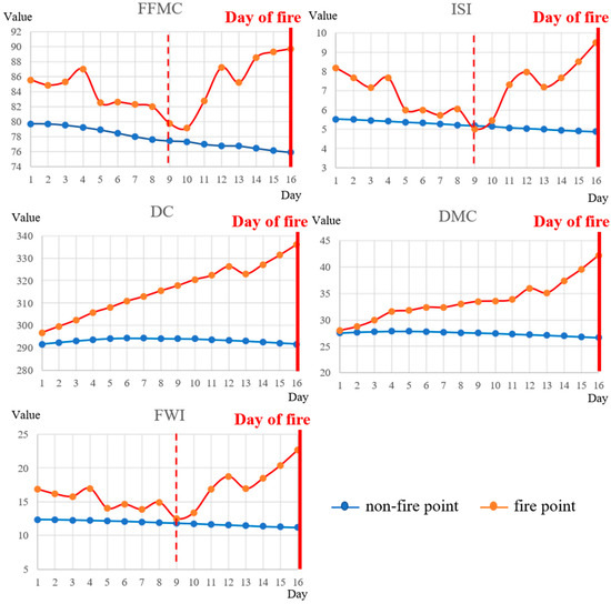 Figure 4 shows the changes of fuel factors (FFMC, DMC, DC, ISI, and FWI) within the 16 days before the fire and the non-fire points. We found that all fuel factors of the fire were significantly higher than the non-fire, which was also consistent with the definition in the FWI system: the larger of the fire weather index, the higher the wildfire danger [7]. FFMC, ISI, and FWI had similar change patterns in that they started to increase significantly on the 8th day before the fire, and they represent the short-term effects of weather and fuel on wildfire danger. DC and DMC had similar change patterns and started to increase slowly on the 16th day before the fire. They represent the long-term wetting and drying process of deep fuel under the influences of weather conditions.