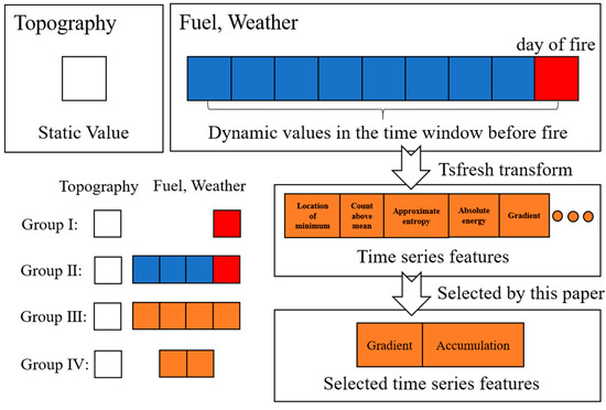 Tsfresh (https://tsfresh.readthedocs.io/en/latest/, accessed on 1 January 2023) is a temporal transformation tool that can be used to calculate a variety of time series features automatically. According to the above analysis, we selected one feature group without time series features and three feature groups with different time series features using the Tsfresh tool. They were shown in Figure 5 and labelled as follows: feature group without time series values (Group I), feature group with time series values (Group II), feature group with Tsfresh transformation of time series values (Group III), and feature group with gradient and cumulative transformation of time series values (Group IV). All four groups shared the same topography factors but differed in terms of weather and fuel factors. Group I contained the weather and fuel values on the day of the fire. Group II contained the daily weather and fuel values in the time windows (Table 3) before the fire. Group III maintained the Tsfresh transformation features based on the time series values. Based on the feature types provided in Table 3, Group IV selected the gradient and cumulative features from Group III.