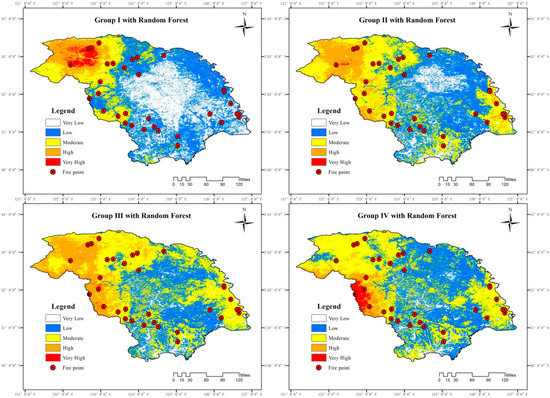 According to the wildfire danger map of Group I, although there is a high wildfire danger on fire points in the northern, the wildfire danger is lower (low and very low) on fire points in most areas of the south and east. All the wildfire danger maps of Group II, III, and IV have higher wildfire danger (medium, high, and extremely high) on fire points. Especially in most of the southern and eastern regions, the corresponding situation of high wildfire danger and fire point are significantly better than the map of Group I.