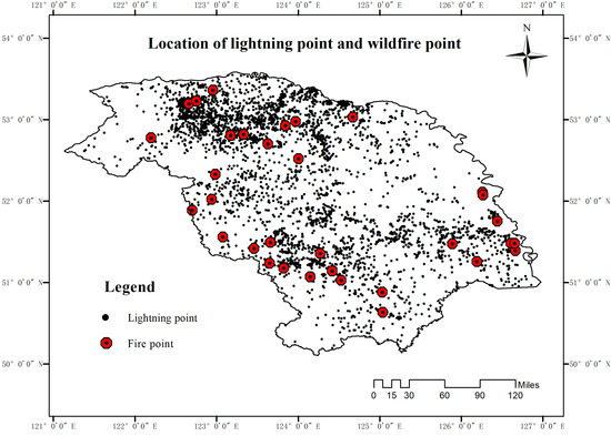 Location of lightning points and wildfire points in the Great Xing’an Mountain region from 31 May to 3 June 2018. Each black dot represents a detected lightning strike.