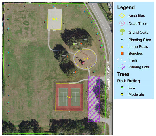 As part of a county-wide inventory in 2020, a team of three ISA Tree Risk Assessment Qualification (TRAQ) arborists conducted risk assessments of 10,917 trees in 144 parks in Hillsborough County, Florida, USA (USDA Hardiness Zones 9b, 10a; Köppen Cfa—humid subtropical climate). Arborists used the ISA BMP on Tree Risk Assessment [10] to conduct assessments over a five-year timeframe. Unless otherwise noted, park users were assumed to be the primary target. Trees near built infrastructure or in maintained areas were assessed with a level 2 or “basic” assessment that involved visually inspecting the tree from a 360° perspective at ground level [10]. Trees growing in stands along the edges between maintained and more natural (unmaintained) areas were assessed with a level 1 or “limited visual” assessment, which is a rapid visual assessment from a single vantage point [10]. Such “edge trees” were only recorded in the dataset if there were the potential that their failure would impact maintained areas. Although trees could have multiple defects, the TRAQ arborists only recorded the primary defect of concern which would result in the highest risk rating in accordance with Smiley et al. [10]. Arborists also geolocated trees in the field using GPS and aerial imagery (Figure 1), identified trees to species, and measured their height and stem diameter 1.4 m above the ground (“DBH”).